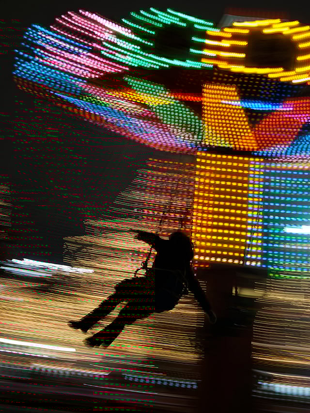A child plays among space-themed holiday lights near a replica of shuttle Independence at Space Center Houston