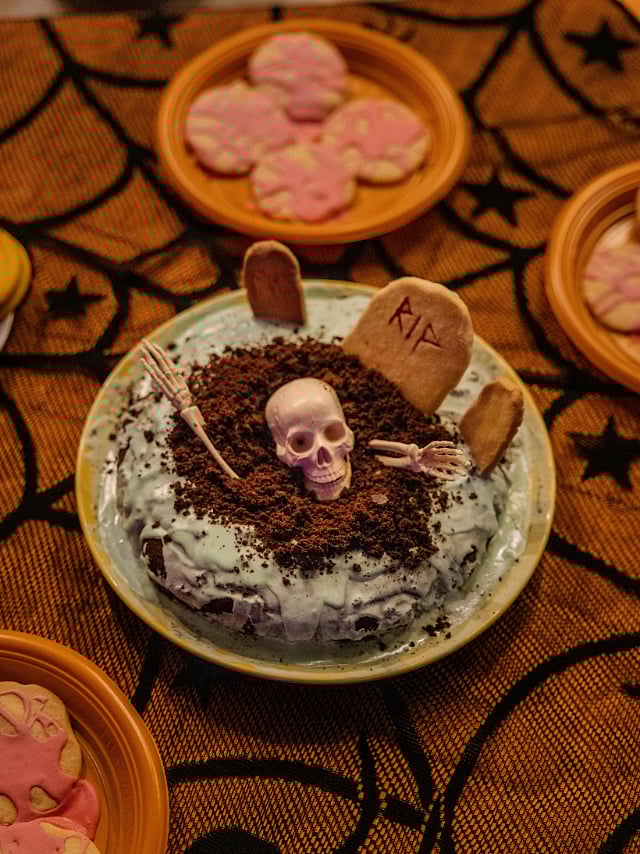 Take a whole blob of burrata cheese, insert a stem to make it look like a pumpkin and paint it with edible food colours like black with silver dust, orange or red.