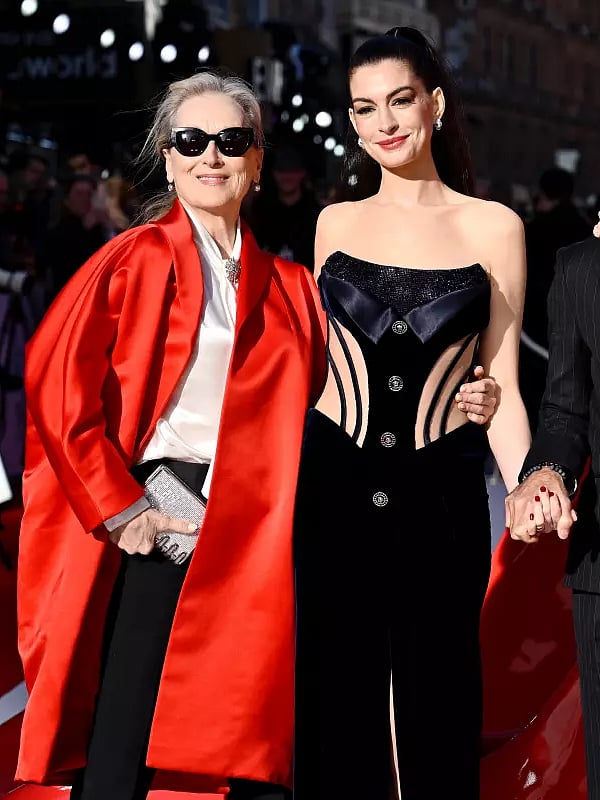 Meryl Streep in custom Prada.Anne Hathaway in archival Versace gown.Emily Blunt in custom Balenciaga.Stanley Tucci in Paul Smith.Simone Ashley in Thierry Mugler.More on Fashion