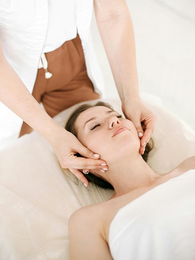 Begin with light strokes from the neck to the forehead. This basic technique helps warm up the skin and activate the capillaries on the surface. It is one of the most effective face massage techniques to improve blood circulation.