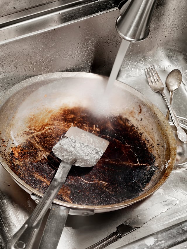 If your pot is burnt, don't throw it away just yet, it can still be saved. The easiest and most effective solution is baking soda. Sprinkle adequate amount of baking soda on the charred areas and add some water so that a thick paste is formed. Let it rest overnight and the next morning, you will see the burnt food has come off.