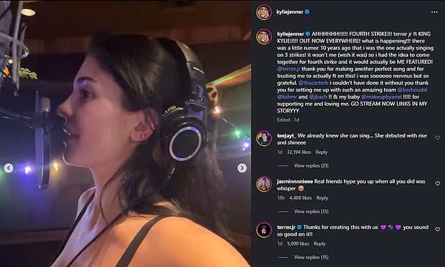 “@terror.jr thank you for making another perfect song and for trusting me to actually ft on this! I was soooooo nervous but grateful. @thecarterb I couldn't have done it without you, thank you for setting me up with such an amazing team @bschoudel @kshmr and @jbach!! & my baby @makeupbyariel!!!! for supporting me and loving me,” Kylie wrote.