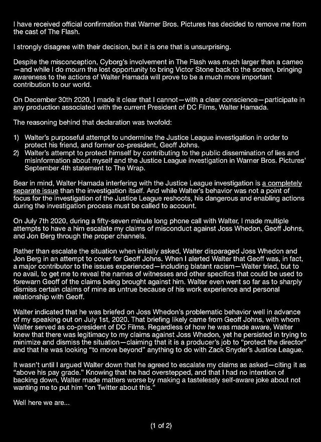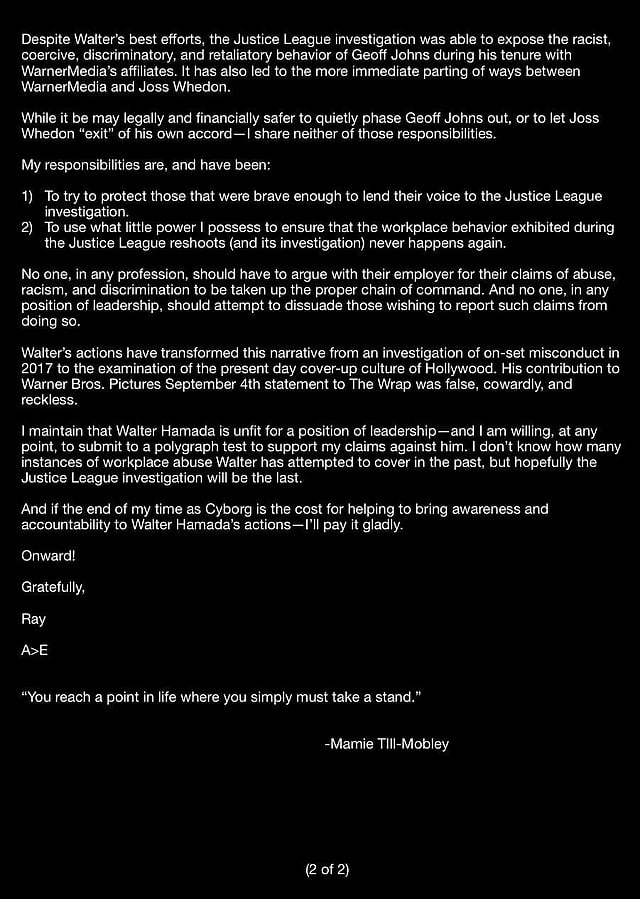 "I strongly disagree with their decision," he wrote. Fisher had earlier commented that he would never work on a movie that Hamada is involved but WB extended Hamada's contract to stay on as the leader of the DCEU. "I maintain that Walter Hamada is unfit for a position of leadership. And I'm willing at any point to submit to a polygraph test to support my claims against him." he wrote.