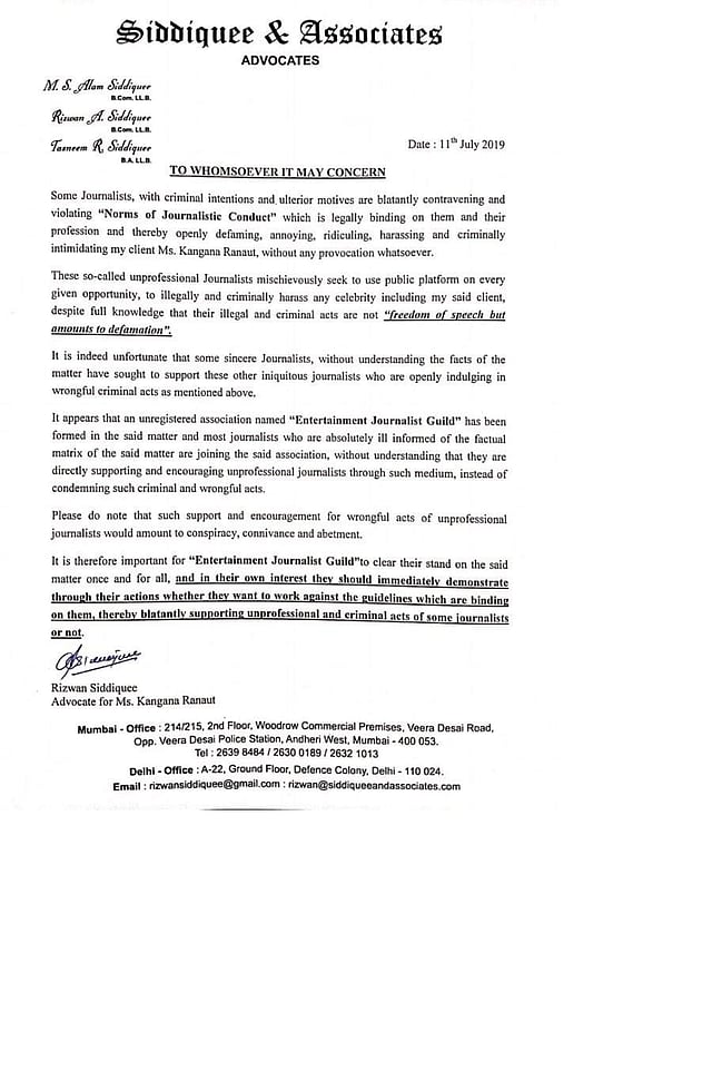 Kangana Ranaut's sister Rangoli Chandel shared their advocate's notice on her Twitter page that accussed media of openly defaming, annoying, ridiculing, harrasing and criminallyintimidating the former. The statement further read that “These so-called unprofessional Journalists mischievously seek to use public platform on every given opportunity, to illegally and criminally harass any celebrity including my said client, despite full knowledge that their illegal and criminal acts are not “freedom of speech but amounts to defamation”.