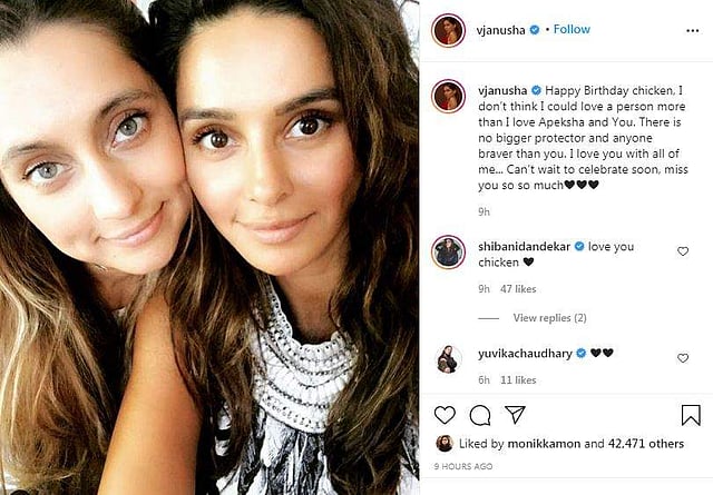 Popular VJ and actress, Anusha wished her sister Shibani on Instagram. She posted an image with her and captioned it, "Happy Birthday chicken, I don't think I could love a person more than I love Apeksha (Shibani and Anusha's sister) and You. There is no bigger protector and anyone braver than you. I love you with all of me... Can't wait to celebrate soon, miss you so so much."