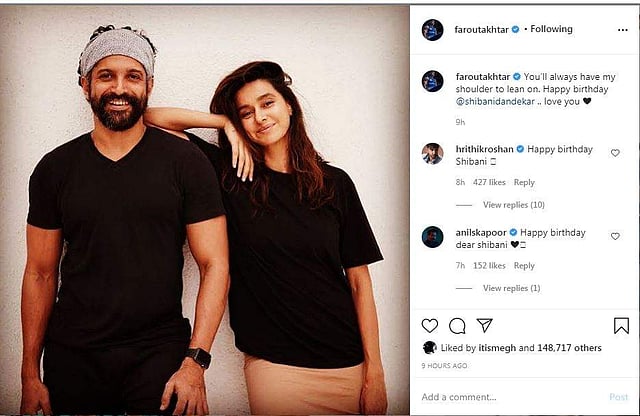 Farhan took to Instagram and posted an image in which he is twinning in black with Shibani. "You'll always have my shoulder to lean on. Happy birthday @shibanidandekar .. love you," he captioned the image. Shibani is seen resting her hand on Farhan's shoulder.