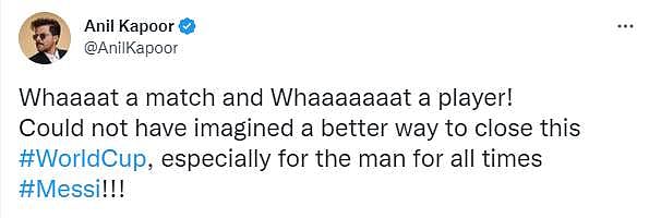 Actor Anil Kapoor too appreciated Messi’s performance and said, “Whaaaat a match and Whaaaaaaat a player! Could not have imagined a better way to close this #WorldCup, especially for the man for all times #Messi!!! (sic)”
