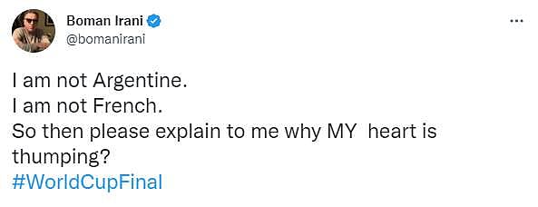 Actor Boman Irani wrote, “I am not Argentine. I am not French. So then please explain to me why MY heart is thumping? #WorldCupFinal.”