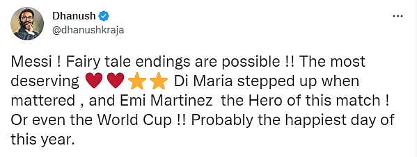 Meanwhile, calling the match a “fairy-tale ending,” actor Dhanush commended Messi, Emiliano Martinez, and Ángel Di María and wrote on Twitter, “Messi ! Fairy tale endings are possible !! The most deserving Di Maria stepped up when mattered , and Emi Martinez the Hero of this match ! Or even the World Cup !! Probably the happiest day of this year.”