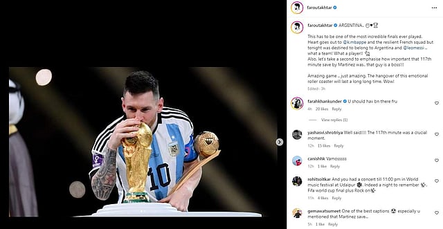 Actor Farhan Akhtar took to Instagram to share a paragraph on the team’s victory and said, “ARGENTINA... This has to be one of the most incredible finals ever played. Heart goes out to @k.mbappe and the resilient French squad but tonight was destined to belong to Argentina and @leomessi .. what a team! What a player!! Also, let’s take a second to emphasise how important that 117th-minute save by Martinez was.. that guy is a boss!!! Amazing game .. just amazing. The hangover of this emotional roller coaster will last a long long time. Wow!”