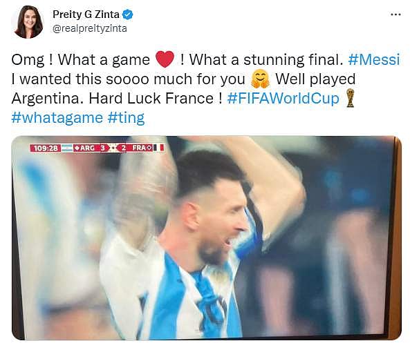 Actress-entrepreneur Preity Zinta too congratulated Argentina and said in her tweet, “Omg ! What a game! What a stunning final. #Messi I wanted this soooo much for you. Well played Argentina. Hard Luck France! (sic)”