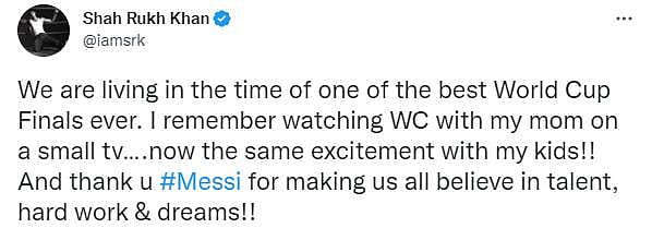 Actor Shah Rukh Khan divulged a small memory involving childhood nostalgia and said, “We are living in the time of one of the best World Cup Finals ever. I remember watching WC with my mom on a small tv….now the same excitement with my kids!! And thank u #Messi for making us all believe in talent, hard work & dreams!! (sic)”