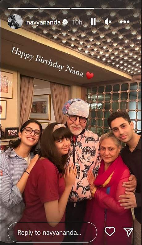 Later, Navya shared a lovely family picture, capturing the joy of the moment. The photo featured Amitabh surrounded by his wife-actor Jaya Bachchan and grandchildren—Navya, Aaradhya, and Agastya Nanda—radiating happiness. Heartfelt wishes poured in, as Navya expressed her love for her ‘Nana’ on the special day.