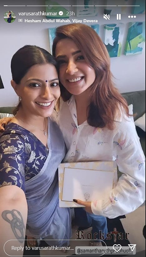On Thursday, fans were treated to photos of Varalaxmi handing out invites to the stunning Samantha Ruth Prabhu and veteran actor Anupam Kher. Sharing a picture with Samantha, Varalaxmi affectionately wrote, “Rockstar.” A second picture captured them both holding the invitation and a gift box, with Varalaxmi adding, “Our rockstar… love u darling.. thank u for being you @samantharuthprabhuoffl.” Samantha reciprocated the love, reposting the story with a simple yet sweet, “Congratulations darling @varusarathkumar.”