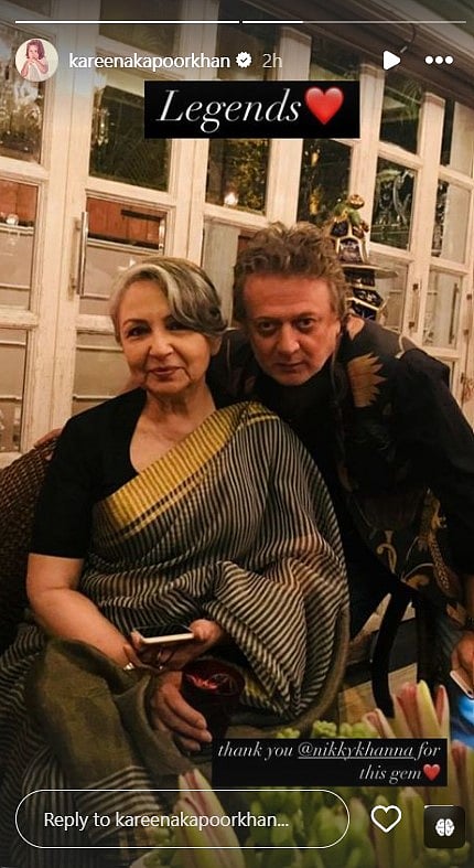Posting the image on her Instagram stories, Kareena offered fans a glimpse into an intimate moment between Sharmila and Rohit. She captioned it “Legends” with a heart emoji and expressed gratitude to Nikhil Khanna for sharing the cherished picture.