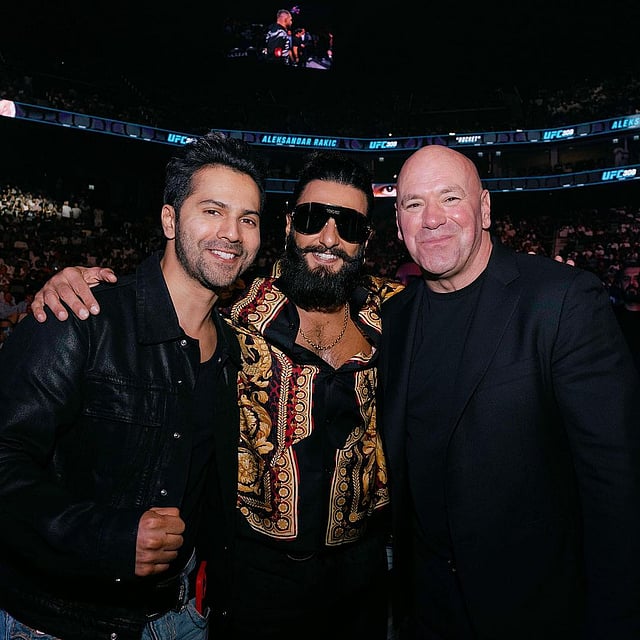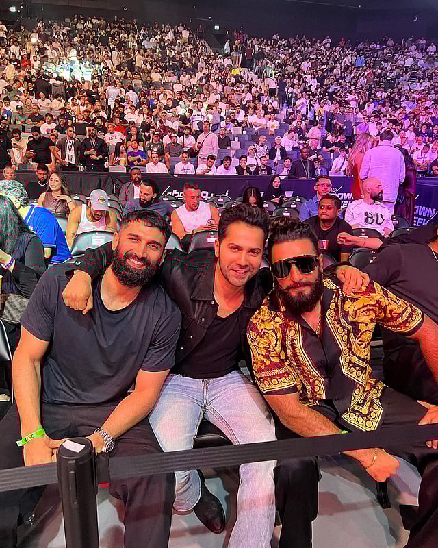 Bollywood actors Ranveer Singh, Varun Dhawan, and Aditya Roy Kapur, recently made a stylish appearance at the UFC Fight Night in Abu Dhabi. The actors, known for their energetic personalities and love for sports, were seen enjoying the high-octane action and soaking in the electrifying atmosphere of the event.