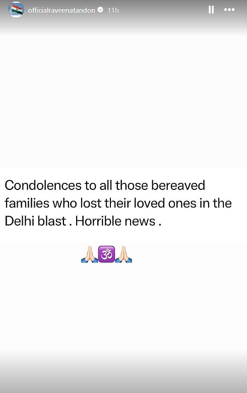 Actress Raveena Tandon shared on social media, “Condolences to all those bereaved families who lost their loved ones in the Delhi blast . Horrible news. (sic).”