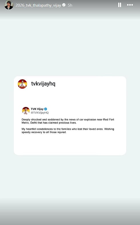 Actor and the leader of the Tamilaga Vettri Kazhagam party, Thalapathy Vijay, also expressed his grief, saying, “Deeply shocked and saddened by the news of car explosion near Red Fort Metro, Delhi that has claimed precious lives. My heartfelt condolences to the families who lost their loved ones. Wishing speedy recovery to all those injured.”