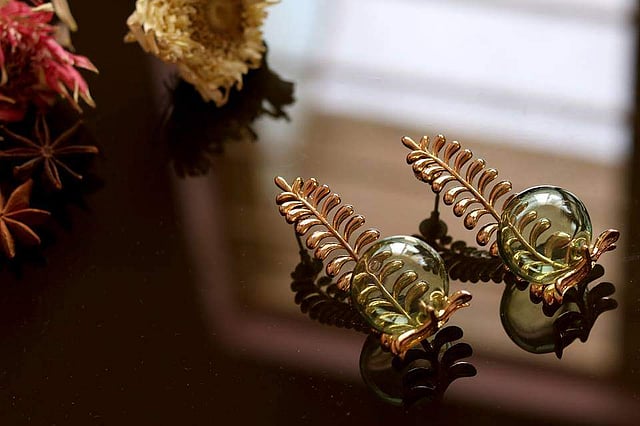 Experimenting with the colour and composition of glass for ornamental purposes, Ahmedabad-based designer Debasmita Ghosh decided to turn her NID graduation project into her jewellery brand Aadikara. Working with glass artisans from the Firozabad cluster in Uttar Pradesh and jewellery smiths from West Bengal, the three-year-old brand creates dainty, light-weight statement handcrafted jewellery that is inspired by nature and landscapes. “Whenever you think of craftspeople in India, you never picture artisans who are working with glass. I believe it is a very underexplored medium, especially when you can create many delicate and intricate pieces of work,” she explains. While the designer picks the jhumkas with meenakari and intricate coloured glass beads from her collections as a must-have, we particularly love the pomegranate and lotus earrings from her latest line. Rs 2,000 onwards.