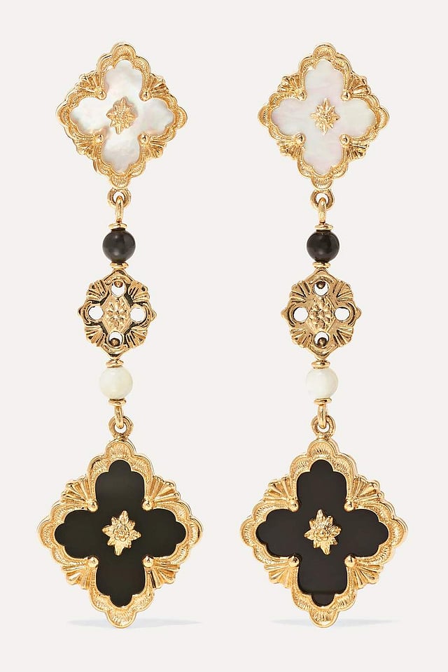 From the Opera collection of Italian label Buccellati comes this pair of earrings that is crafted from 18-karat gold. It takes inspiration from the design found on opera doors and is inlaid with mother of pearl and onyx. Rs.6,39,430 approximately