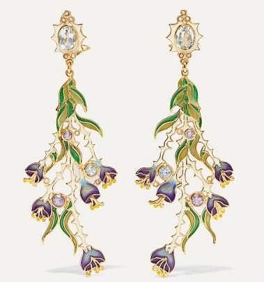 Percossi Papi’s enamel earrings are cast from gold-plated metal. Featuring violet flowers and leaves in multiple shades of green, they are studded with stones such as amethyst and topaz besides pearls. Rs.84,100 approximately