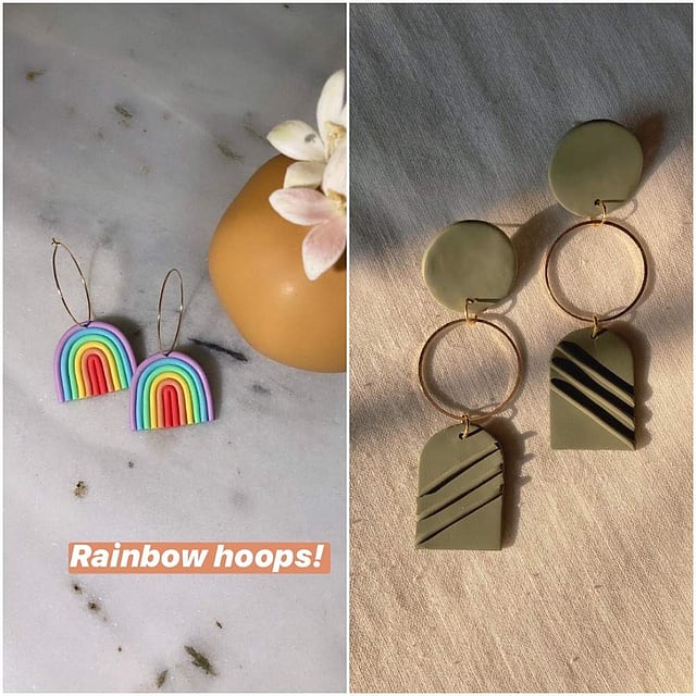 While handmade jewellery is not a novelty in India, this boho-chic avatar is certainly a twist on the craft. ”In the Indian market, clay jewellery is often ornate and ethnic-leaning,” explains Samriddhi. Modern and minimal, Unbaked’s repertoire offers an entire gamut of whimsical earrings like rainbow studs to more refined, classy geometric silhouettes with an almost marble-like finish — and they are influenced by the designer’s everyday life. This inspiration is quite evident in the brand’s latest capsule called Vicarious Womxn. “This capsule is special to me because it echoes common sentiments and the frustration we all have towards 2020.” A limited-piece edit, the line features faces of women at a music festival decked up with a flower barrette, on vacation with a floppy hat and even on a brunch date with her girls.