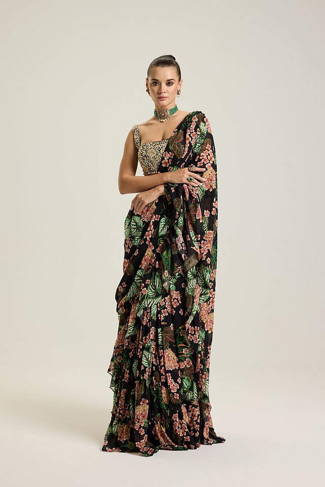 Prints and patterns are the heart and soul of fashion, breathing life into fabrics and transforming them into wearable art. The vibrant symphony of colours, the intricate interplay of shapes, and the mesmerising amalgamation of patterns all converge to weave tales of artistry and imagination. These prints do more than just adorn fabric; they transform it into a canvas of expression, a storyteller whispering secrets of distant lands and timeless traditions. Wearing these creations is an act of revelry — a celebration of beauty, heritage, and individuality. Interestingly, the brand Prints by Radhika has come up with a new collection Botanique’s Festive Edit. It features exquisite traditional pieces with a contemporary twist. As the name suggests, this edit showcases stunning floral prints and the vibrant essence of tropical landscapes. Each piece embodies the beauty and vitality of nature, merging timeless elegance with modern flair.