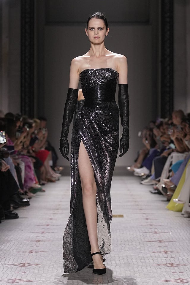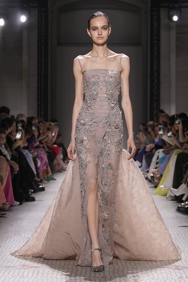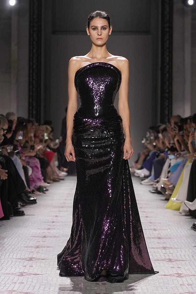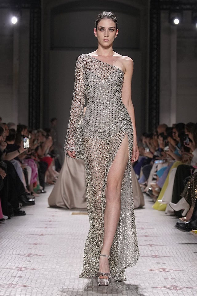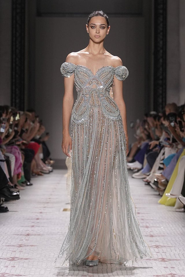 Saab, renowned for his exquisitely feminine designs that fuse Western silhouettes with Middle Eastern embellishments, took a deeper dive into the unknown this season. Sequined spiderwebs adorned bodices, necklines rose and plummeted dramatically, and cascading capes evoked a sense of otherworldly elegance.