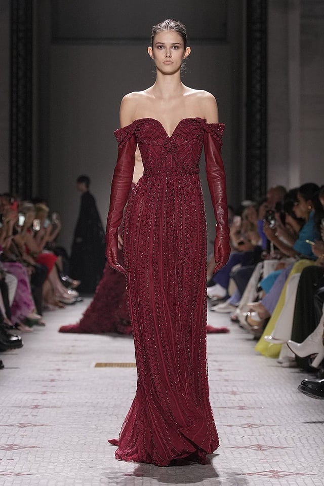 “In beauty, too much perfection becomes boring,” Saab declared, hinting at his exploration of a more enigmatic side of femininity. Deep reds and pitch blacks dominated the palette, with crushed velvet, mesh, and lace taking centre stage. He masterfully layered shimmering fringed skirts, cascading beadwork, and ethereal mesh, adding a touch of his signature glamour to the mystical themes.
