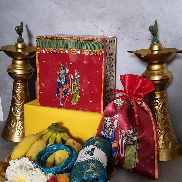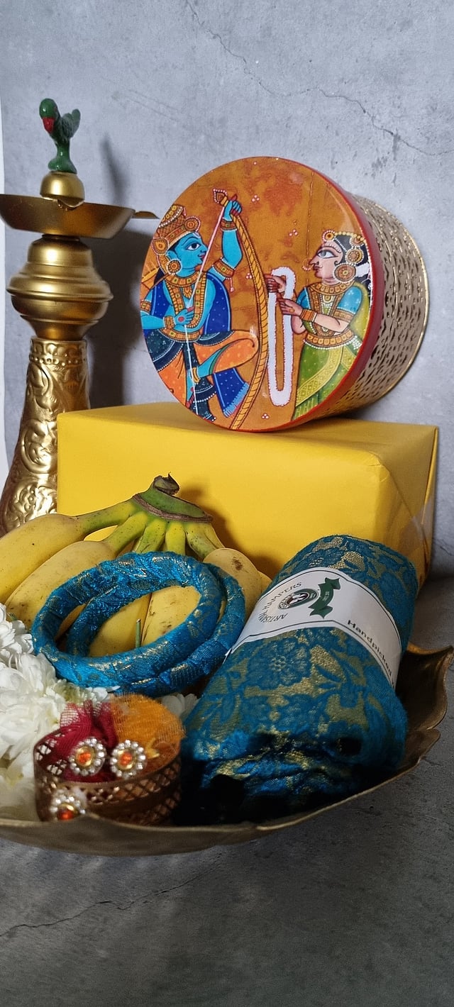 From ornate metal trunks and gift boxes in circular and square shapes to decorative jars, the collection currently includes five pieces. “The metal trunks and boxes are imbued with intricate detailing reminiscent of bygone eras, while the potlis exude elegance with their fine raw silk canvases captivating digital prints.” shares Mithra Levis, founder.