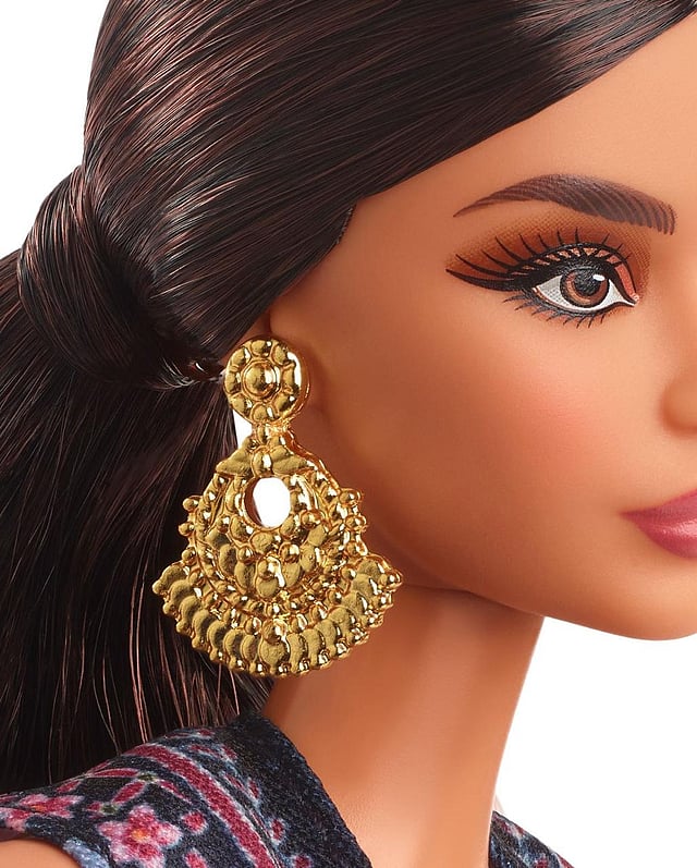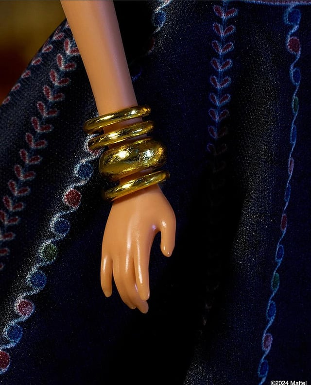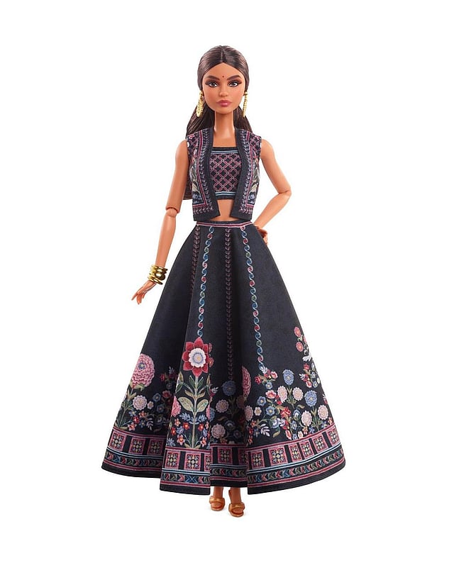 The doll’s outfit offers a contemporary take on the traditional lehenga, combined with a Rajasthan-inspired koti vest and decorated with nature-themed motifs. The floral lehenga, featuring dahlias, jasmine, and lotus flowers, symbolises strength and beauty, perfectly encapsulating the spirit of Diwali. This unique look embodies the fashion-forward, modern Indian woman while showcasing the artistry and traditions of India on a global stage.