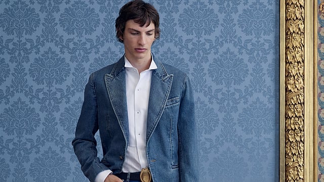 Anderson's choice of fabrics also reflects a historical perspective, with Donegal Tweeds representing traditional British tailoring and Denim being used in all forms, from tail coats to cargo shorts, which gives another modern, contemporary look. These choices provide an interesting contrast to small details within the collection, such as embellishments and Rococo-inspired Diorette Charms and enlarged Arms of Coat graphics, which reflect Anderson's interest in intricate details and different types of textures.