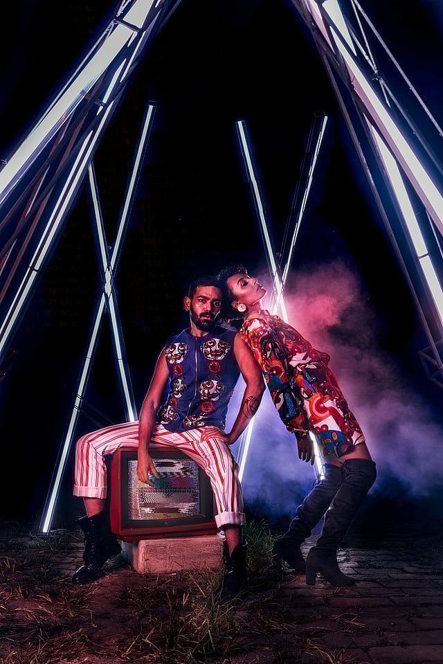 An artist turned designer, Bobo Calcutta’s founder/creative director, Ayushman Mitra believes that the body is to be treated like a protest poster. “My work has always been inspired by love, the central motif of an androgynous split face seen locking lips features in most of the garments,” shares the 27-year-old. Kaleidoscopic in nature, Ayushman’s creations are made by digital printing his artworks on surfaces ranging from silk to muslin.“Why hang art on the walls when it can be worn and start conversations about things we need to talk about?” he asks.