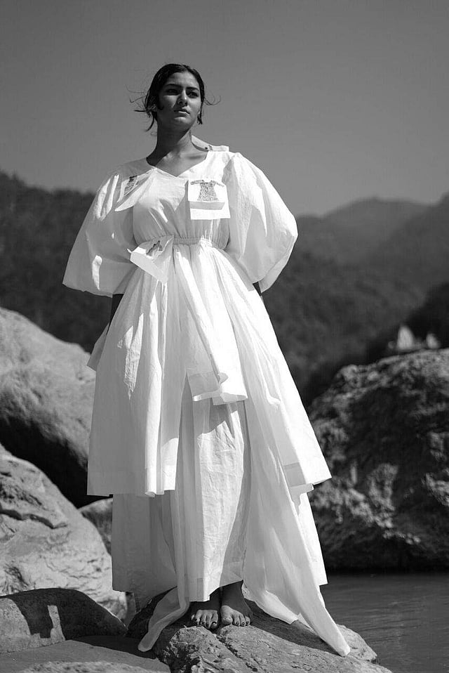 Mohammed Mazhar’s collection presents the designer work created over periods of extensive engagement with the workers at dhobi ghats. The line, which is hinged on the monochrome of white complemented with hues of black and rust, involves motifs that reflect his deep interest in bringing to light artisans that indirectly contribute to the fashion industry. “The idea for the collection came from the marking seeds/bhalwa that are used as a mark by dhobis to distinguish clothes. We used these marker seeds to develop a series of bhalwa prints.” Working with cotton, lawn, and malmal fabrics, the 27-year-old from Saharanpur showcases a collection of layered silhouettes.