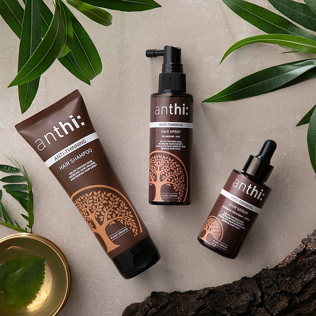 Gift a hair transformation with anthi: Anti-Thinning Regimen Kit. Packed with potent plant extracts and essential oils, this three-step system (Shampoo, Day Spray, and Night Serum) helps thicken hair, reduce breakage, and boost volume.