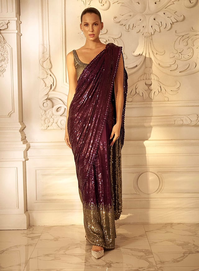 Make a statement this wedding season with a custom cocktail saree by Sawan Gandhi. The Wine to Grey Sequin Saree is the ultimate showstopper, blending traditional craftsmanship with modern flair.