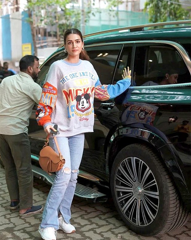 Kriti Sanon was spotted wearing a cute and fun sweater featuring Mickey Mouse, adding a playful touch to her outfit. The whimsical design gave her look a lighthearted and charming vibe.
