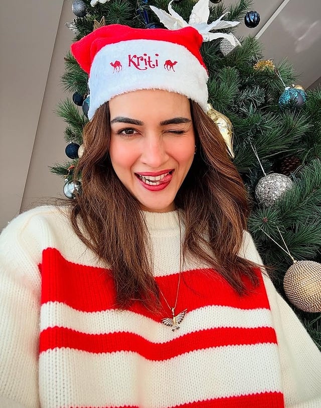 Kriti Sanon looks super cozy in her red and white sweater from Solid and Striped. She paired it with a cute Christmas cap with her initials, giving off the perfect festive vibe that's both cute and fun.