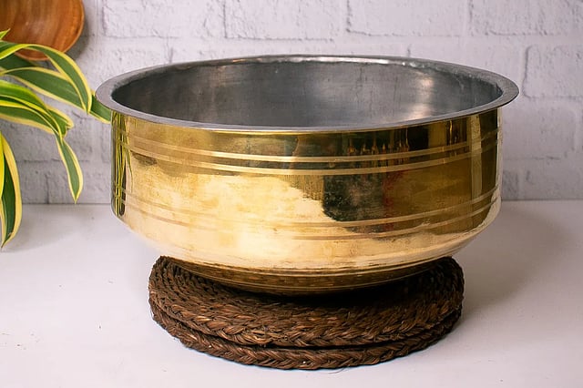 Using traditional brass cookware blends tradition with sustainability. Renowned for its excellent heat distribution and retention properties, brass ensures even cooking, reducing the risk of hot spots and burning. Its durability guarantees longevity, making it a wise investment for generations. Furthermore, brass utensils are resistant to corrosion, ensuring they maintain their quality over time. Brass is a recyclable material, contributing to the circular economy and reducing environmental impact. Try using the Brass Kadai from Essential Traditions. INR 5,500.