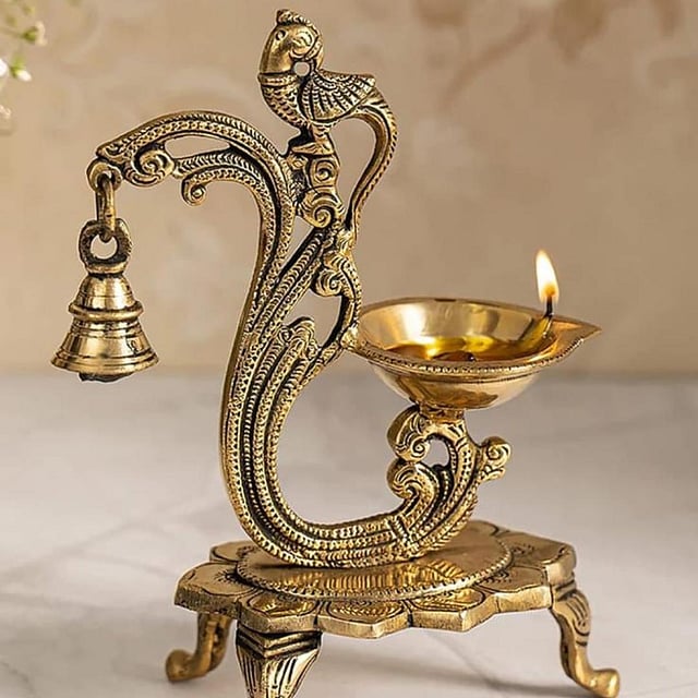 This beautiful handcrafted All Auspicious Brass Diya from The Nook & Gather Co stands six inches in height. The intricate design features traditional Indian motifs with elegant curves, including a detailed peacock figure on the arm holding a small bell. The brass finish adds a vintage charm, while its steady base ensures stability during use.
