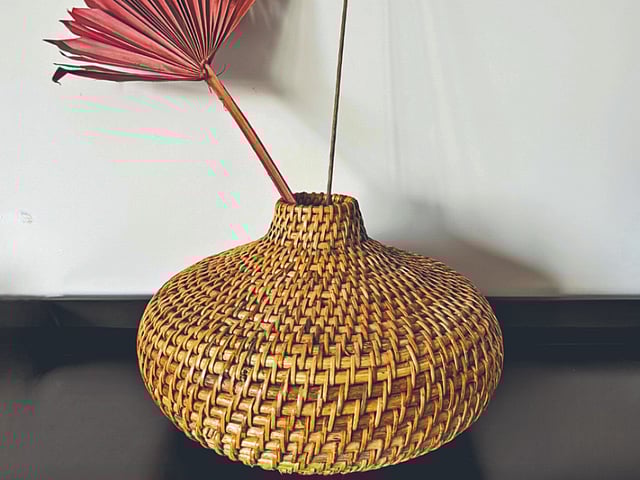 Brighten up dull corners with the beautifully handwoven Srishti Vase by The Green Collective. This versatile piece can be used as it is or filled with dry flowers or faux greens to introduce an earthy vibe to your space. Crafted from natural rattan, this vase is expertly hand woven with strips of cane bark and finished with a clear varnish that enhances its natural appearance. The varnish also makes for easy cleaning.