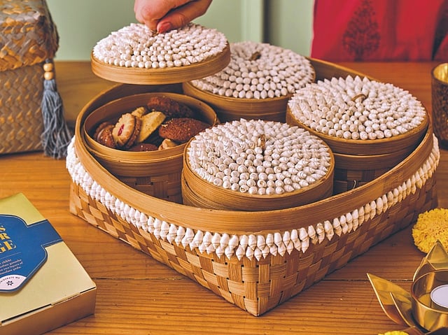The Shell Dynasty Basket from Jodoh features four bamboo storage containers, creating a stylish storage solution that enhances any tabletop this Diwali. Each box is topped with white conch shell lids, adding a touch of elegance to the entire set. This makes it an excellent gift choice for anyone who appre ciates unique and sustainable décor items. Also their White Wave series of bamboo baskets are perfect additions to earthy décobaskets.