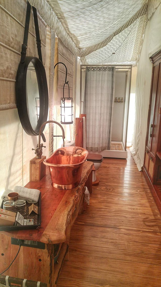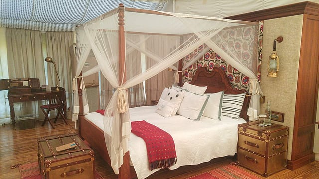 Our triple-layered tent was well-insulated and comfortably appointed with a large four-poster bed, a generous wardrobe designed like an upright vintage leather trunk, and a spacious bathroom with round-the-clock hot and cold water.