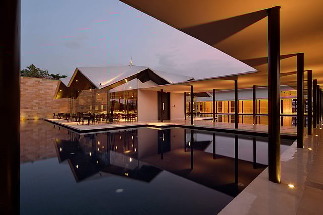 Dubbed as the first hotel in India whose interiors and design are inspired by the ten avatars of Lord Vishnu, the hotel doesn’t really exude a religious vibe at first glance. But on further prying, we learn that the hotel is designed according to the aesthetics of a classic temple, and at its heart lies a tribute to Vishnu and his ten avatars though ten different spaces in the hotel, starting with the swimming pool to the spa. At night, the hotel transforms into a riot of colours, as hundreds of lights dazzle and light up the entire property, coupled with an impressive fountain in the central open courtyard and water-body, which also resembles features found in a temple.