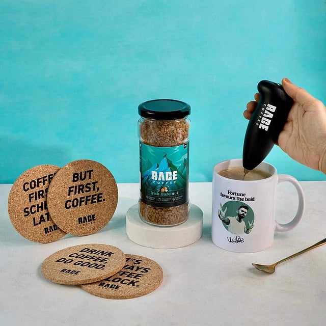 This limited edition hamper from Rage Coffee includes a 50 gms Irish Hazelnut flavoured instant coffee jar, Rage Coffee’s Premium Matte Finish Frother + Virat Kohli's Signature Mug + 4 Cork Coasters with Quirky Coffee Quotes. They are produced via the small-batch roast technique, thereby having no bitterness in taste alongside zero acidity. These all-purpose grinds are handcrafted to perfection with velvety cafe-like smoothness. All products are also gluten-free with no added sugar and vegan-friendly. They are made from 100% Arabica beans and offer a perfect caffeine kick to anyone. INR 1,149.